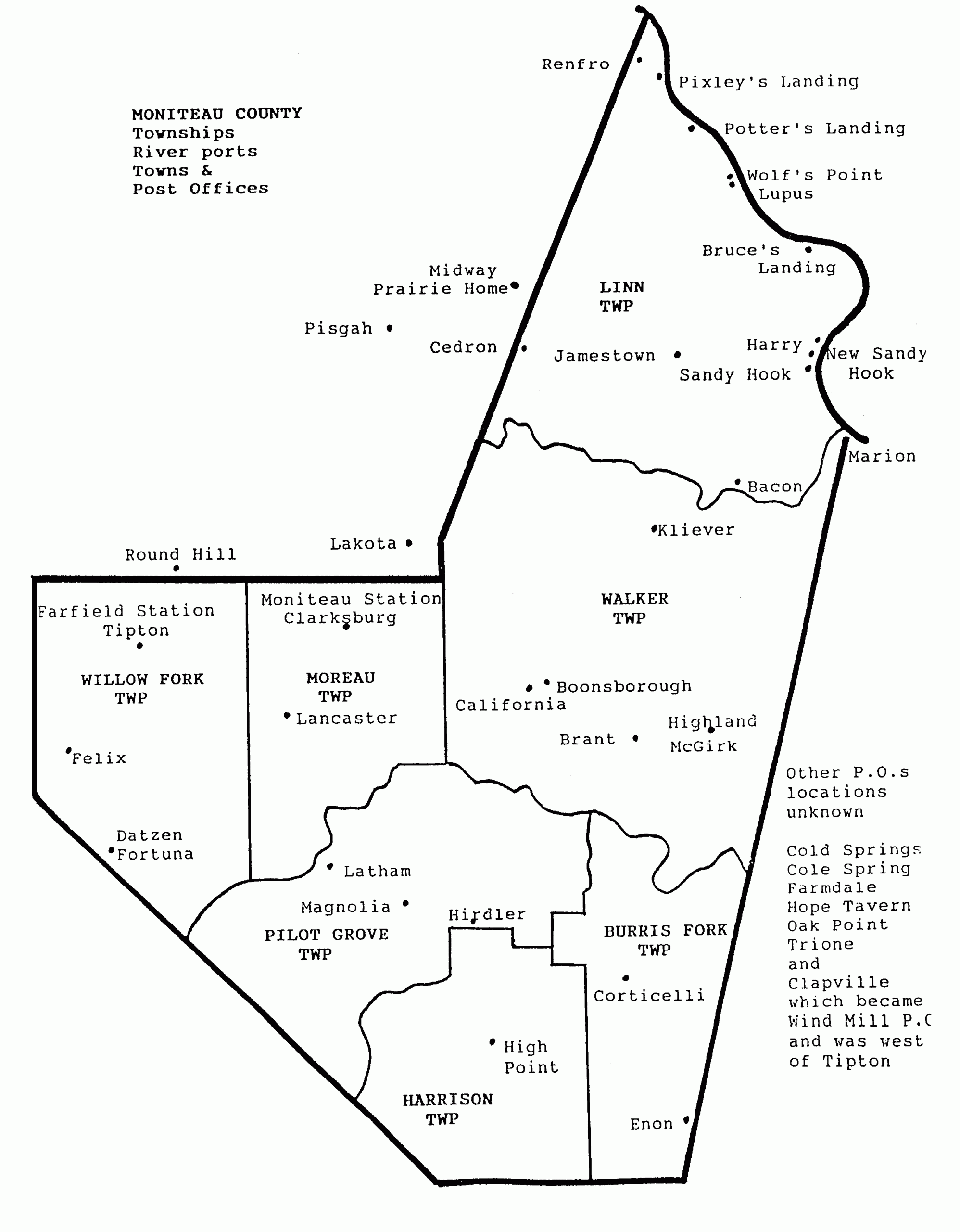 Historic Map of Moniteau County Townships, River Ports, Towns and Post Offices