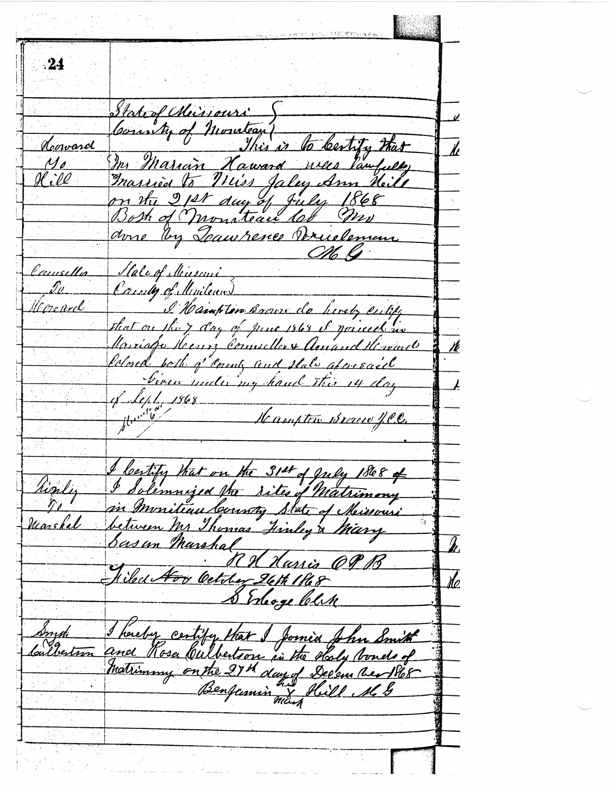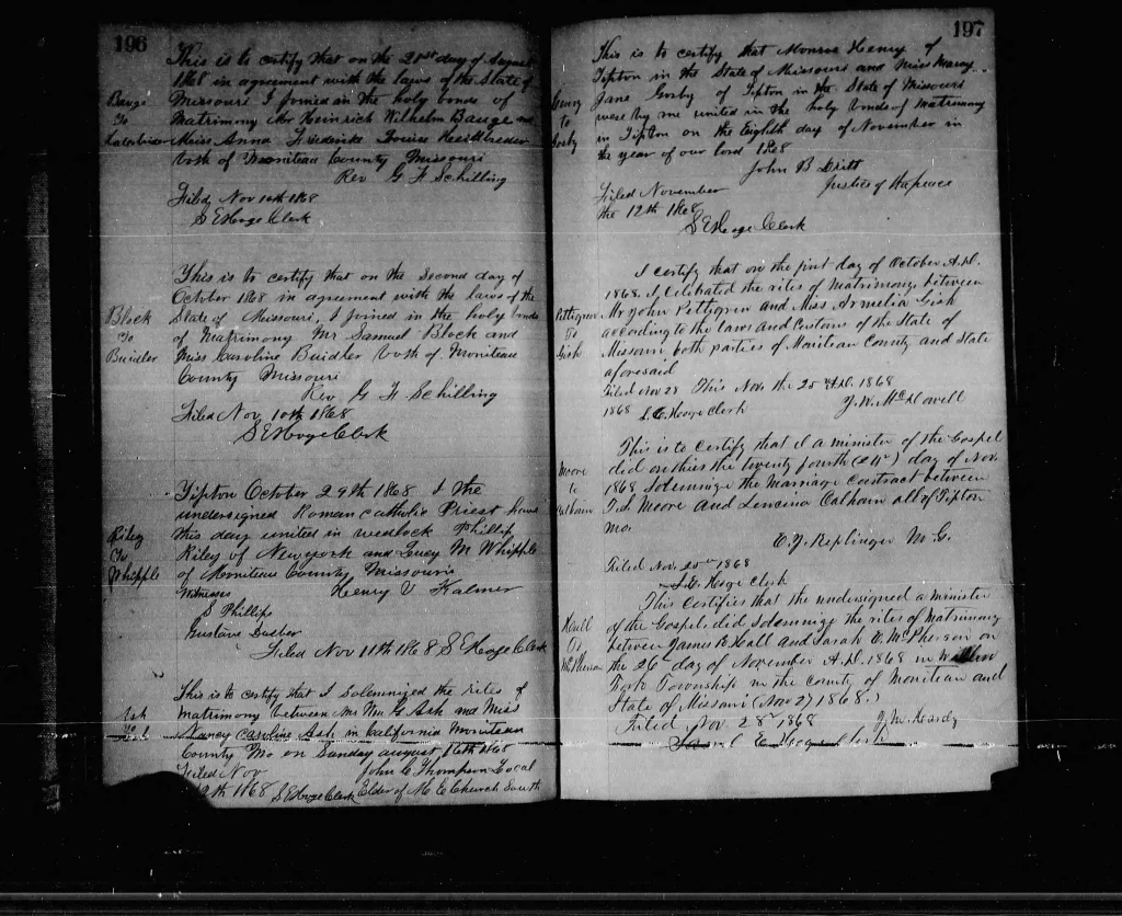 Starting in 1845, when Moniteau became a county, the first marriages were recorded. Presented here are over 175 years of marriages.